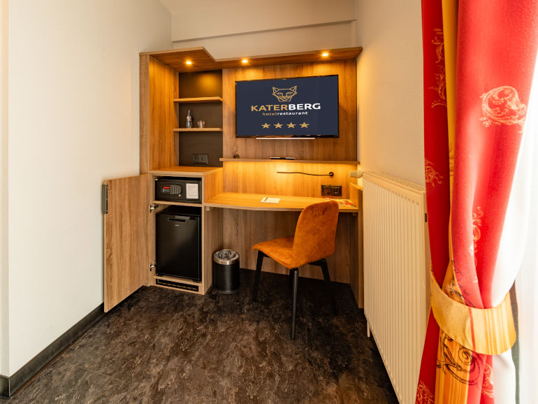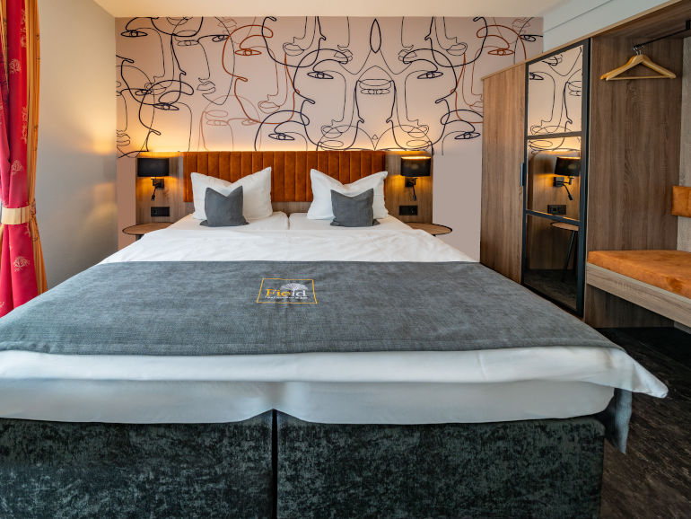 Unsere modern gestalteten Komfort Zimmer bieten den idealen Mix aus Design, Funktionalität und Wohlfühlambiente. Samtige Stoffe in Trendfarben schaffen ein behagliches Gefühl von Zuhause. Ein großzügiges Boxspringbett (180 x 200 cm) sowie ein funktionaler Schreibtisch bieten ausreichend Platz zum Arbeiten und Entspannen – ideal für Geschäftsreisende und alle, die auch unterwegs nicht auf Komfort verzichten möchten.Einige Zimmer dieser Kategorie verfügen über eine Dachschräge.